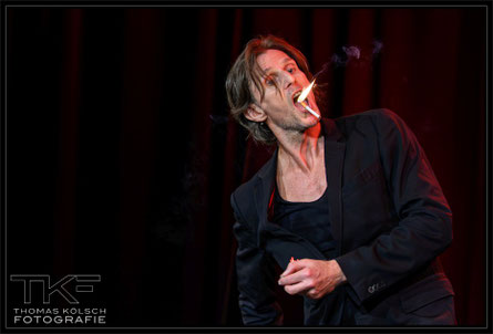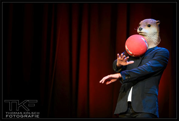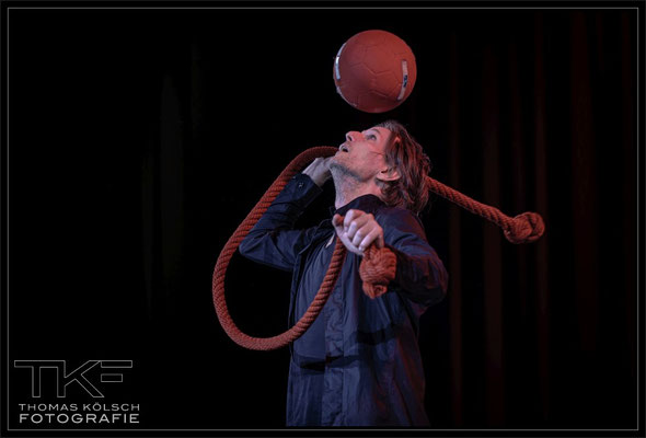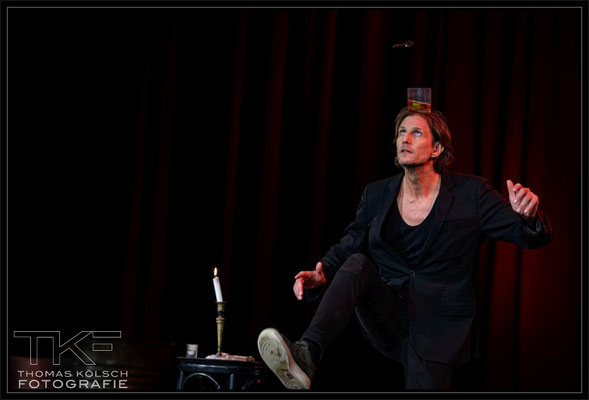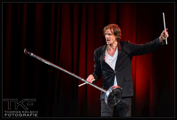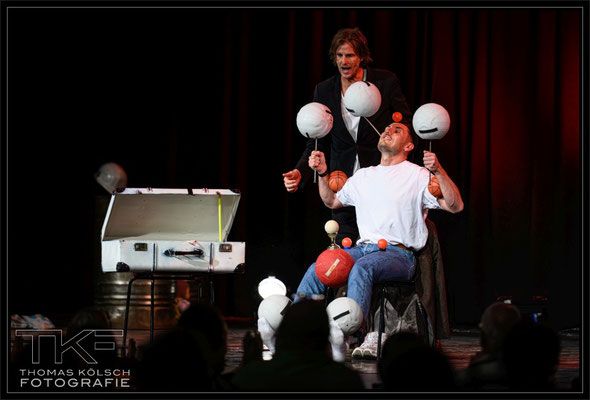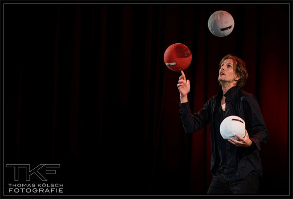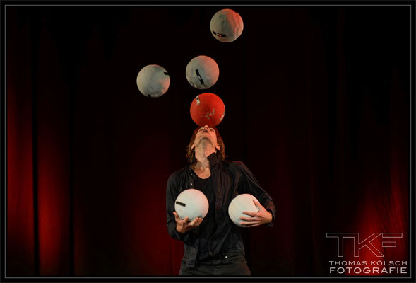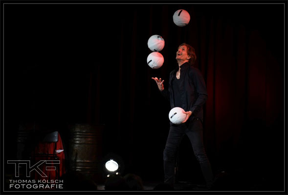 Schon direkt zu Beginn geht Wessels in die Vollen und nimmt sich sechs Fußbällen an, die ausnahmsweise mal nicht getreten werden, aber trotzdem einen Drehwurm kriegen. Insgesamt ein halbes Dutzend hält er in der Luft, scheinbar mühelos; nur zusätzliches Seilspringen will an diesem Abend nicht gelingen. Ist aber auch nicht schlimm, auch so ist die Nummer auf allerhöchstem Niveau, atemberaubend schön (vor allem die Kontaktjonglage am Anfang ist fantastisch) und zudem sowohl sehenswert als auch sichtbar. Letzteres ist nicht selbstverständlich: Kleine, körpernahe Darbietungen drohen auf der großen Pantheon-Bühne mitunter unterzugehen, und genau aus diesem Bereich hat Wessels so einiges im Repertoire. Ob er nun versucht, versucht, beim Jonglieren einen Apfel sowohl mit einer Gabel als auch mit einem Messer aufzuspießen oder eine zur Wurfmaschine umfunktionierte Mausefalle mit einem Blasrohr auszulösen (was streng genommen natürlich keine Jonglage ist), das etwas weiter entfernt sitzende Publikum hat es nicht gerade leicht, Wessels zu folgen. Was angesichts der kreativen und ein bisschen verrückten Ideen ziemlich schade ist.